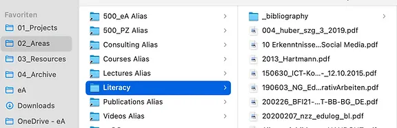 Files, for example articles, that I download as PDFs, I store in a file folder. I read the PDFs in a normal PDF reader and mark the important text passages with the highlight function. I link the read and edited articles during my work step, distilling. My files are in the cloud, which makes the individual documents available to me at any time and makes them easy to link and/or share. (2)